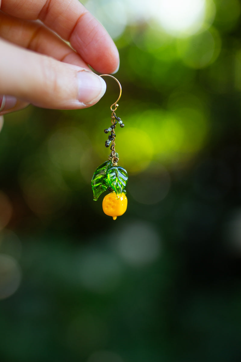 Boucle d’oreille unique (une seule, pas en paire) citron cubique et feuilles en verre filé à la flamme, perles de péridot et diopside, le crochet est en or laminé (fin placage).